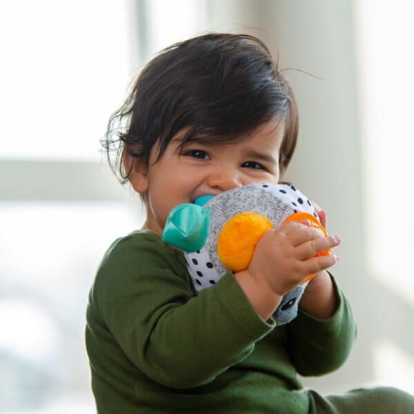 Les bosses de différentes tailles encouragent bébé à tendre la main, saisir, manipuler et passer l’objet d’une main à l’autre – des gestes essentiels pour le développement moteur.