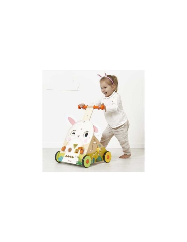 Découvrez le chariot de marche Lapin de Janod, un jouet en bois à pousser pour apprendre à marcher et pour éveiller les enfants dès 12 mois.