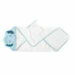 Ce coffret Za Ni Mo réunit une cape de bain 75×75 cm avec sa capuche éléphant et un gant assorti, pour envelopper votre tout-petit dans une douceur totale dès la sortie de l’eau.