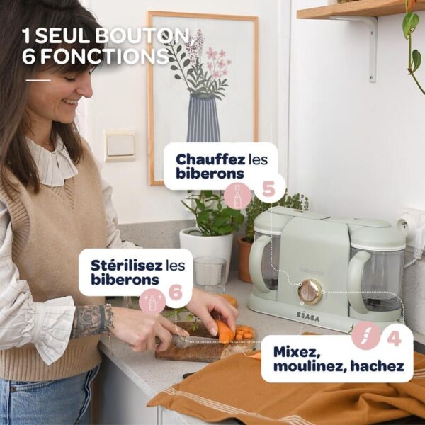 Fonctions 6 en 1 : cuisson vapeur, mixage, décongélation, réchauffage petits pots, réchauffage biberons, stérilisation