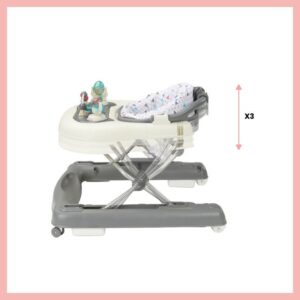 Pour favoriser l’éveil de bébé, ce trotteur dispose d’une tablette de jeux d’éveil avec 3 jouets et d’une boite à musiques qui joue 3 mélodies.